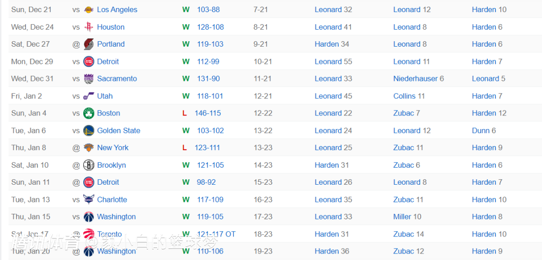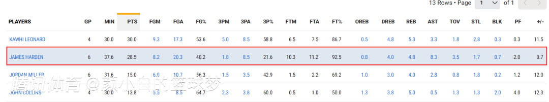 过去的6场比赛小卡只打了4场但快船全部取得了胜利,过去的15场比赛小卡只打了13场,快船也取得了13胜2负的战绩,过去的15场比赛哈登打了14场,场均登场时间哈登场均37.3分钟,小卡场均36分钟。