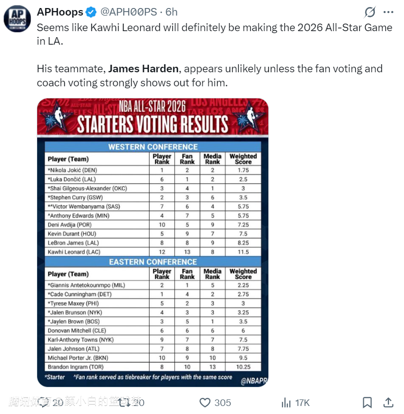 北京时间1月20日,NBA官方公布了最终的全明星球迷投票,快船的莱昂纳德561253排在第13,快船的哈登599911排在第12。