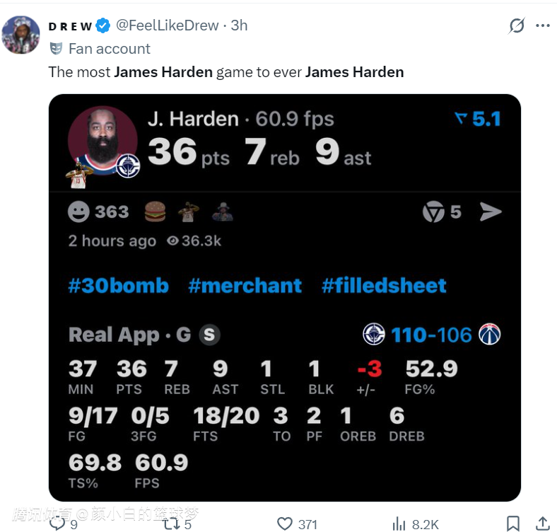 对阵奇才的这场比赛,哈登37分钟,17中9,罚球18中20,拿到36分9助攻7篮板1抢断1盖帽,命中率52.9%,真实命中率69.8%,他又打出了全面的表现。