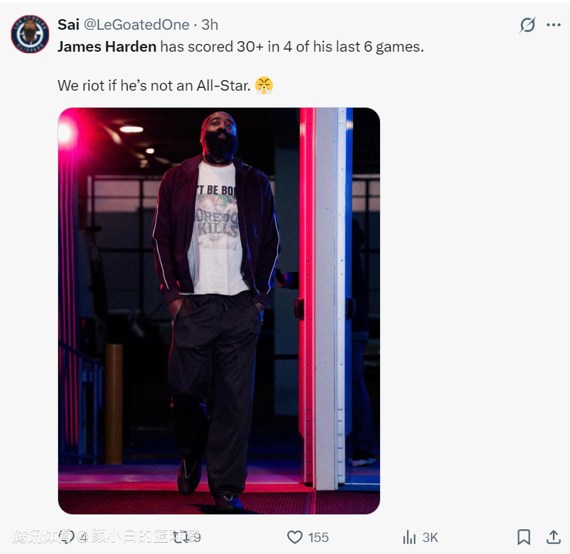 过去的6场比赛哈登拿到了4场30+,快船的13胜2负,哈登场均26.3分8助攻3.9篮板1.2抢断0.3盖帽,这样的表现真的很差吗?船媒直言:如果他没有入选全明星,我们就闹事儿。