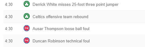 从慢动作回放来看,当时德里克-怀特出手三分球,奥萨尔-汤普森在篮下卡位抢篮板时被吹罚了犯规,随后裁判又吹罚了一次技术犯规,但这次技术犯规实际上是吹给邓肯-罗宾逊的(响哨时他曾大吼裁判),对于裁判的吹罚,奥萨尔-汤普森非常不解,他用手指着自己询问裁判:“吹我犯规?什么?”