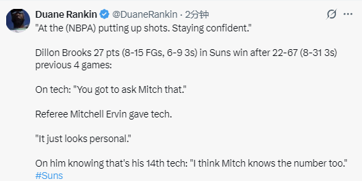 值得一提的是,这已经不是狄龙本赛季第一次因为吃T而在赛后吐槽裁判针对他了。此前在太阳队与奇才队的比赛中,狄龙就曾因为吃T,在赛后怒喷当值裁判斯科特-特瓦多夫斯基,还表示这名裁判对他有偏见,因为在太阳队对阵湖人队的比赛中,该裁判被詹姆斯推搡都没吹T。