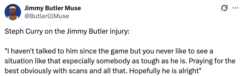 谈及巴特勒受伤倒地时的反应,库里表示:“这场景我以前从没见过。通常你都以为他会自己站起来,但他躺在地上的时候还在开玩笑,这就是巴特勒的本色。他当时还想走上罚球线,并且表示这是两次罚球的机会。你永远不想看到这种情况,尤其是发生在他这样坚韧的球员身上,我们为他祈祷,希望一切安好。”谈及巴特勒如果缺席可能带来的变化,库里表示:“我们需要依靠团队整体来应对。”