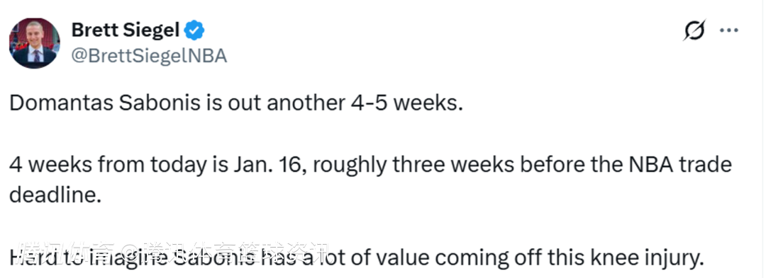 另外美记Brett Siegel也报道称,距离NBA交易截止日大约还有三周时间,很难想象,刚经历这次膝伤的小萨博尼斯还能保有很高的交易价值吗?