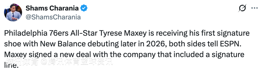 北京时间1月20日,据Shams报道,费城76人后卫马克西将推出个人首款签名鞋,由New Balance打造,预计2026年晚些时候正式发布,据消息人士透露,马克西已经和New Balance签下一份新合同,其中就包括个人签名鞋系列。