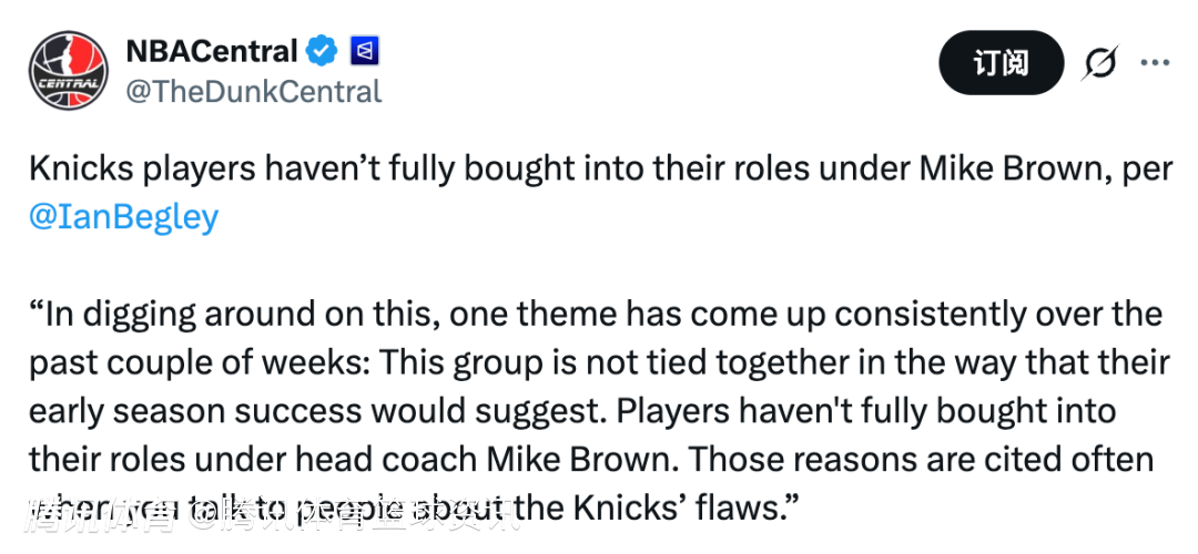 Begley表示:“在深入了解此事的过程中,过去几周有一个主题反复出现,这支球队的凝聚力,并不像赛季初取得成功时表现得那样强。球员们并未完全接受主教练迈克-布朗为他们设定的角色。当人们谈论尼克斯队的问题时,这一点经常被提及。”