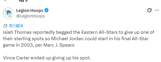 北京时间1月21日,据ESPN名记Marc J.Spears报道,“微笑刺客”伊赛亚-托马斯当年曾恳请东部全明星队的首发球员让出一个位置,以便乔丹能在2003年的生涯最后一届全明星赛中首发登场。最终,文斯-卡特主动让出了自己的首发名额。