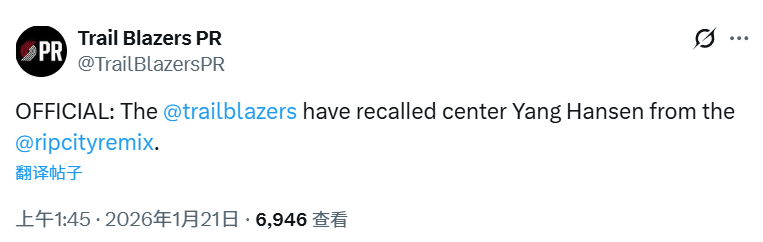 北京时间1月21日,开拓者官方宣布从混音队召回杨瀚森。另外,有媒体统计了开拓者队内所有球员的全明星球迷得票,杨瀚森排名第三。