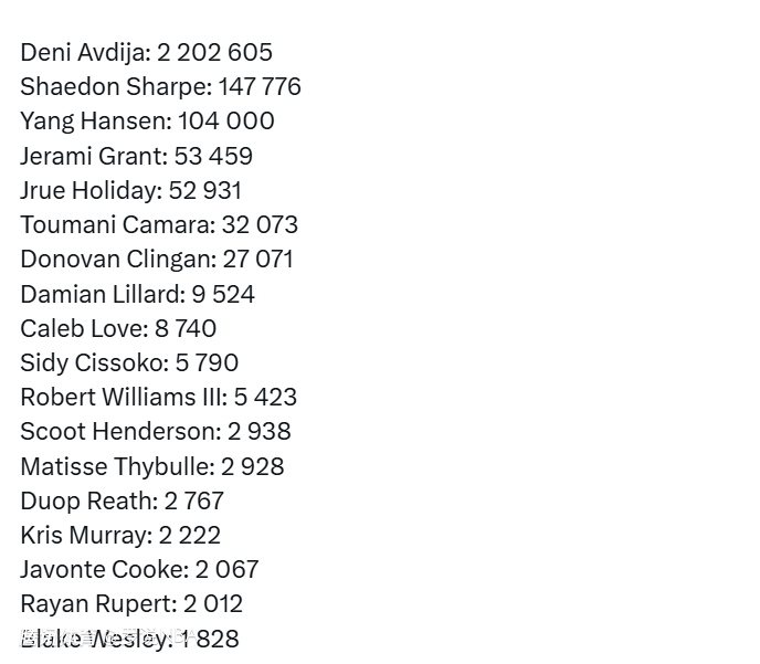 有媒体统计了开拓者球员在球迷投票环节的得票情况。阿夫迪亚2202605票断层领先全队,开拓者得票第二多的球员是谢登-夏普,他得到147776票,而杨瀚森得到104000票,位居第三。格兰特和霍勒迪分列第四和第五。以下是所有人的具体票数——
