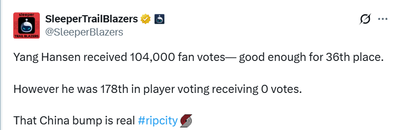 媒体SleeperTrailBlazers写道:“杨瀚森收获104000张球迷选票,排名第36位。然而在球员投票环节,他一票未得,位列第178名。中国人气效应果然名不虚传。”