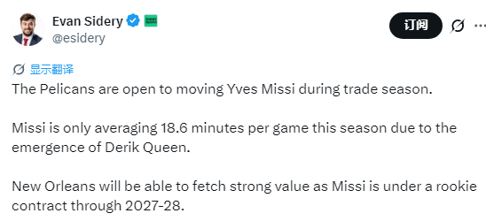 Sidery表示,凭借一份有效期至2027-28赛季的新秀合同,鹈鹕有望为米西争取到不菲的交易筹码。近日有消息称,猛龙在交易截止日前瞄准多位内线球员,以补强球队中锋位置的深度,其中已将米西视作极具可行性的目标。