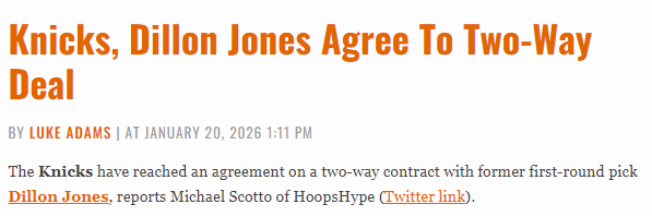 北京时间1月21日,据记者Michael Scotto报道,尼克斯队已与前首轮秀狄龙-琼斯达成一份双向合同协议。