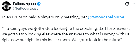 遭遇4连败之后,布伦森召开了一次仅限球员参加的内部会议,布伦森在会议上表示:伙计们,别再盯着教练看了,我们必须停止找别人的问题,我们目前问题就在这个更衣室里,我们必须照照镜子’,我们必须反省自己。