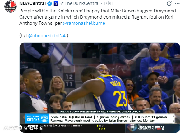 Ramona Shelburne报道,那次拥抱让纽约许多人感到不适,尽管理解他与格林的情谊,但这显然不被尼克斯团队接受。