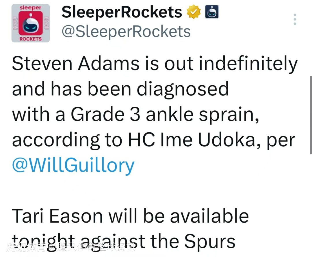 乌度卡透露,亚当斯遭遇脚踝三级扭伤,将无限期缺阵。伊森在今日对阵马刺的比赛将可以出战。在火箭以119-110击败鹈鹕的比赛中,亚当斯首发登场27分钟,全场3投2中,罚球2中1贡献5分10篮板2助攻。比赛第四节,亚当斯抢篮板落地膝盖受伤,被搀扶回更衣室并提前退赛。赛后,乌度卡表示亚当斯脚踝扭伤肿得很厉害,但没有骨折。