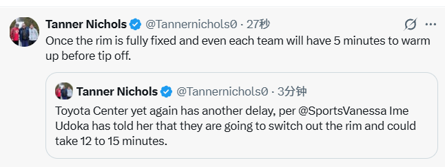 现场记者透露,乌度卡告诉自己,工作人员将更换篮筐,预计耗时12至15分钟。在篮筐修好后,双方球员回到场上热身5分钟,然后再开始比赛。
