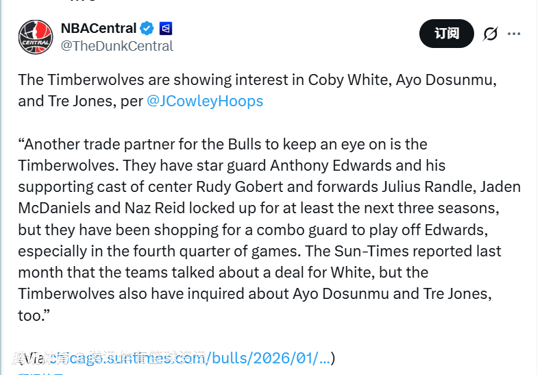 北京时间1月21日,据公牛队记Joe Cowley报道,森林狼队目前正对公牛队科比-怀特、道森姆以及特雷-琼斯三名球员表达兴趣。