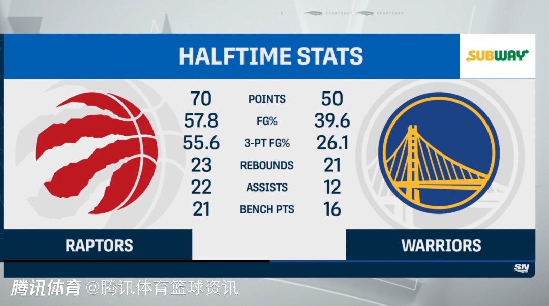 猛龙队奎克利3人得分上双,上半场全队投篮命中率57.8%,三分球命中率55.6%。