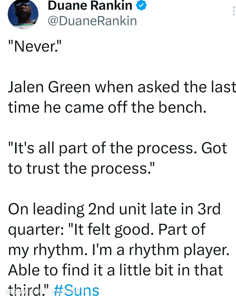 北京时间1月21日,NBA常规赛继续进行,太阳以116-110战胜76人。本场比赛中,太阳球星杰伦-格林生涯首次替补出战,投篮11中4,其中三分4中2得到12分2篮板3助攻2失误。赛后,他接受媒体采访。