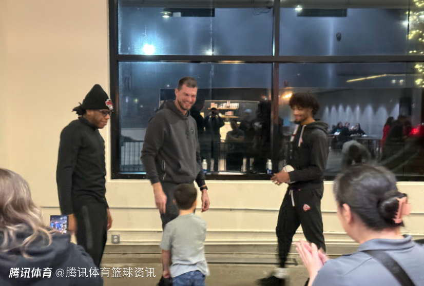 今晚找瀚森合影的球迷络绎不绝,他在房间内挨个与球迷合影问候,队伍排到电梯口,活动持续了近两个小时,大部分队友则在楼下流动拍照。另外一个有趣的细节事情——不少体格很大国外的球迷,反而特别钟意那件印有杨瀚森的中文球衣。