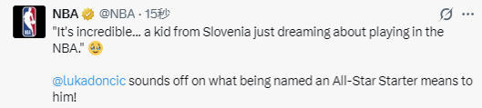 在谈到自己当选全明星票王的感受时,东契奇回答道:“这太不可思议了。我想感谢所有为我投票的人,也请大家多关心斯洛文尼亚。你知道,我小时候只是梦想着打NBA,能有今天这样的成就,我感到非常荣幸。所以我真的很感谢大家。”