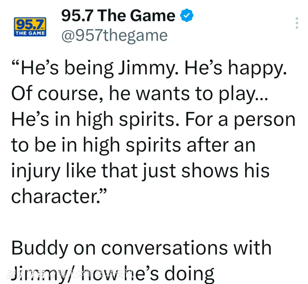 希尔德在谈到与巴特勒的交流及后者近况时说道:“他还是那个老样子的巴特勒,心态很不错。他当然渴望回到赛场,而且现在精神头十足。遭遇这样的伤病后,还能保持如此高昂的情绪,这恰恰彰显了他的过人品格。”