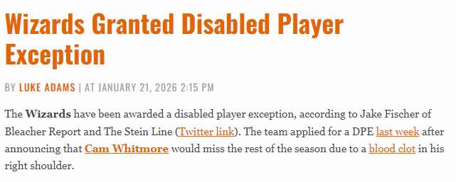 该特例的使用截止日期为3月10日,而奇才队的这份特例大概率会到期作废。究其原因,该金额在交易市场中实际可操作性极低,且球队本身还持有更具价值的其他特例,包括完整的非奢侈税线中产特例以及多项交易特例。不过,留着这份伤病球员特例以备不时之需,对球队而言也并无损失。