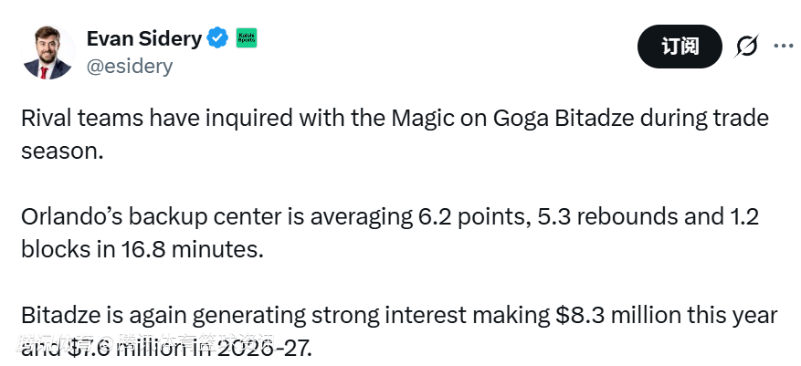 北京时间1月22日,据记者Evan Sidery报道,交易窗口期内,多支球队已向魔术队询价比塔泽。