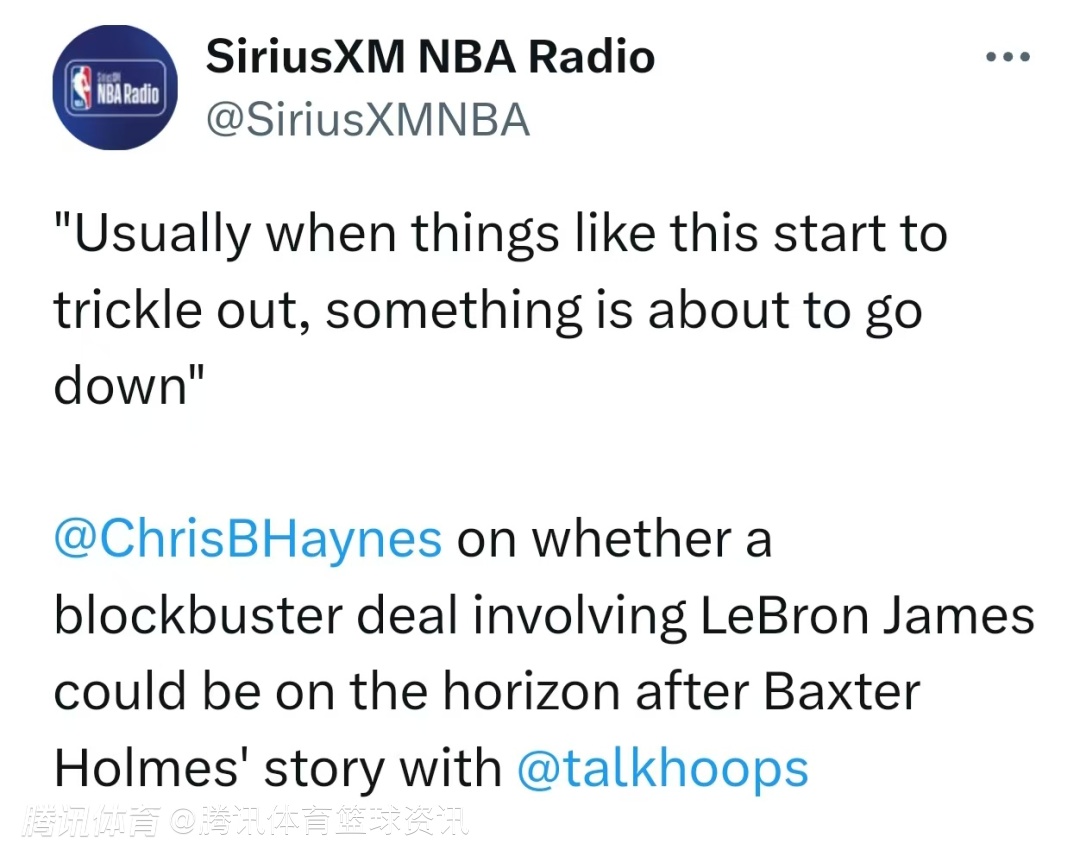 名记Chris Haynes在做客电台节目时,谈及詹姆斯可能被卷入重磅交易的话题,他表示:“我不禁疑惑,这篇文章为何选在此时发布?通常这类消息逐步流出时,就意味着联盟即将有大事发生。我暂时不清楚具体会是什么事,但事情的发展往往都是如此。”