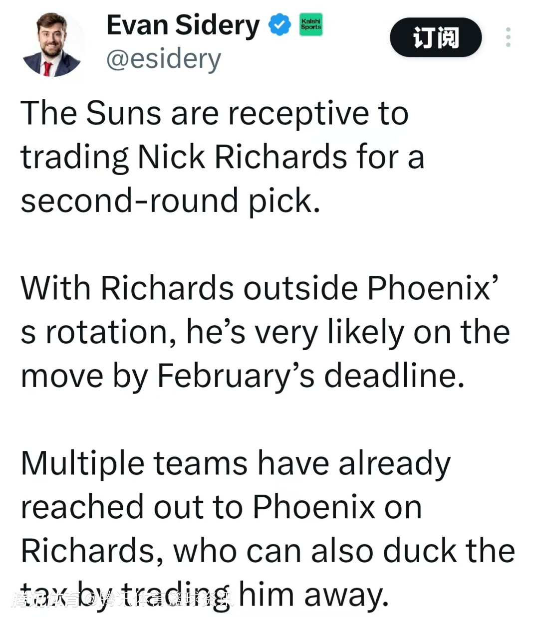Sidery表示,由于理查兹已跌出太阳队的轮换阵容,他大概率会在2月交易截止日前被送走。已有多支球队就理查兹的交易事宜联系了太阳队,送走他还能帮助太阳队规避奢侈税。