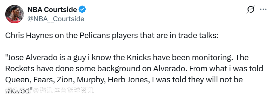 北京时间1月22日,名记Chris Haynes在节目中爆料,火箭与尼克斯均有意鹈鹕后卫阿尔瓦拉多,同时他还谈及了鹈鹕的阵容调整动向。