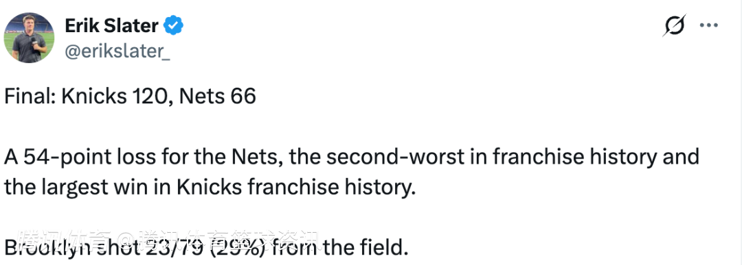 首节比赛,尼克斯就已经取得38-20的大幅领先,此后三节,他们每节都净胜篮网,让比赛早早失去悬念。篮网全场仅得66分,创下联盟所有球队本赛季的单场最低得分纪录。另外尼克斯这54分大胜,也是他们队史最大的赢球分差,而54分的惨败,则是篮网队史第二大分差的失利(最大失利是2025年1月26日以67-126惨败快船)。