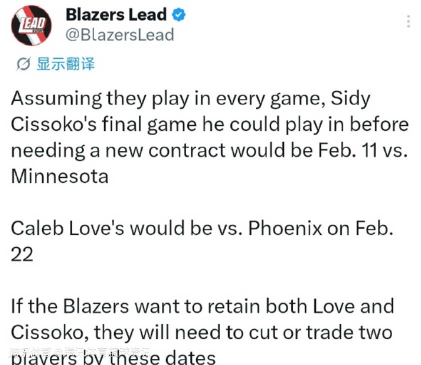 北京时间1月22日,据开拓者自媒体Blazers Lead报道,如果接下来西索科和乐福出战每一场比赛,西索科能攻出战的最后一场比赛是2月12日(北京时间)对阵森林狼的比赛,凯莱布-乐福的最后一场可出战比赛则是2月23日对阵太阳的比赛。