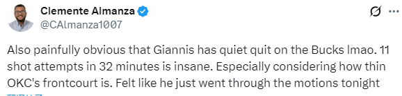 对于字母哥本场的表现,雷记Clemente Almanza评价道:很明显,字母哥已经彻底放弃雄鹿了,哈哈。32分钟就11次出手,简直不可思议。尤其是考虑到雷霆今天的前场非常单薄。感觉他今晚只是在敷衍了事。