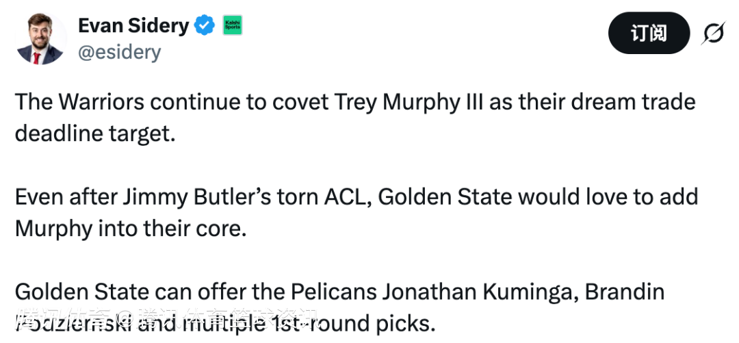 即使在巴特勒遭遇前交叉韧带撕裂之后,金州勇士仍然非常希望把墨菲加入球队核心阵容,球队可以向鹈鹕提供的筹码包括库明加、波杰姆斯基以及多个首轮选秀权。