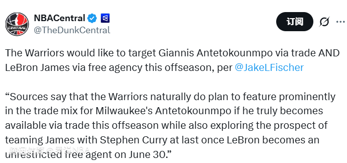客观而言,勇士队预计最早要到休赛期,才有可能争取得到字母哥或詹姆斯