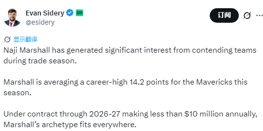 北京时间1月23日,据记者Evan Sidery报道,在交易窗口期,独行侠球员马绍尔已引发多支争冠球队的高度关注。