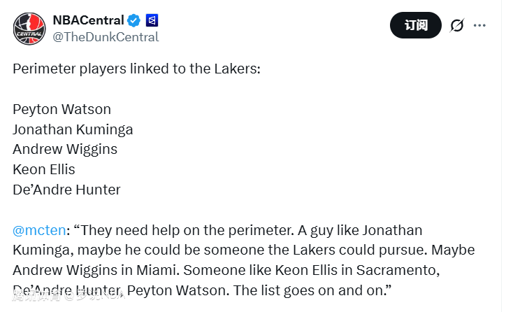 “湖人的外线急需补强。像乔纳森-库明加这样的球员,或许会是球队的追逐目标。还有可能是在迈阿密效力的安德鲁-维金斯。另外,萨克拉门托的基翁-埃利斯,以及德安德烈-亨特、佩顿-沃特森等人也在备选之列。这份潜在引援名单还有很长。”