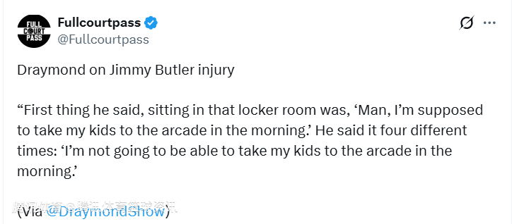 追梦说道:“巴特勒坐在更衣室里说的第一句话就是:‘兄弟,我本来早上还答应带孩子们去游戏厅的。’这话他翻来覆去说了四遍:‘这下早上没法带孩子们去游戏厅了。’”