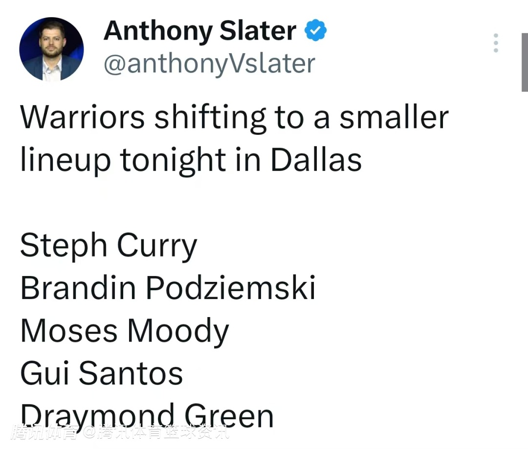 北京时间1月23日,NBA常规赛继续进行,勇士对阵独行侠。赛前,勇士方面公布本场比赛首发阵容。主帅科尔排出一套小个阵容,库里领衔出战,吉-桑托斯进入首发。