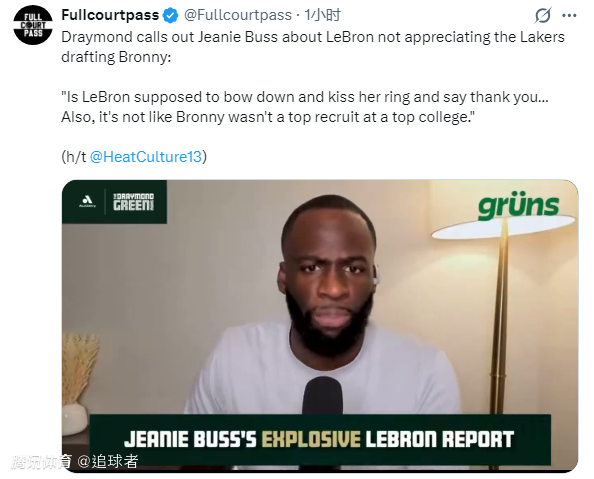 北京时间1月23日,近日ESPN名记Baxter Holmes长文爆料珍妮-巴斯对詹姆斯不满的各个事项,其中包括詹姆斯对湖人选中布朗尼不感恩,不过珍妮-巴斯本人已经辟谣,今日勇士球员追梦格林在节目中直言,巴斯家族有人故意挑拨他们的关系。