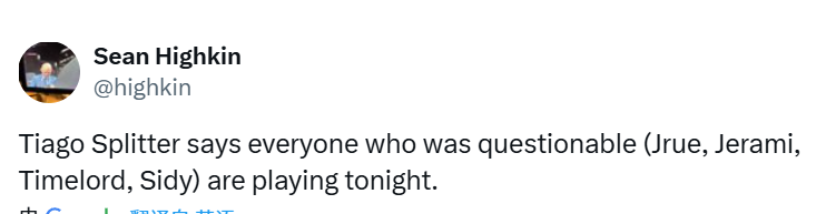 斯普利特表示,此前出战成疑的球员霍勒迪、格兰特、罗威、西索科今晚均将登场。此前,球队已宣布从G联盟撕裂之城混音队召回中锋杨瀚森。罗威和格兰特能出战,也意味着杨瀚森的上场机会可能又少了。