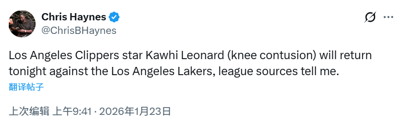 北京时间1月23日,NBA常规赛继续进行,湖人队对阵快船队。赛前,快船队宣布,莱昂纳德此役将迎来复出。