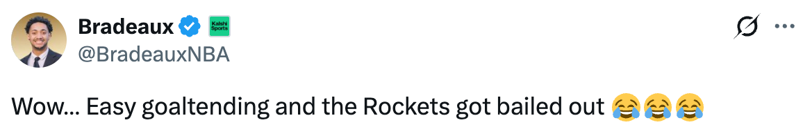 最后时刻,马克西突破上篮,想要完成一个打板的绝杀,杜兰特明显干扰球,但裁判却给了跳球,这也让76人主帅纳斯非常不满,最终比赛进入加时赛。随后火箭队记Bradeaux也发文写道:“很明显的干扰球,火箭侥幸躲过一劫。”