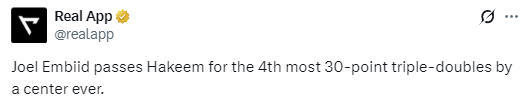 根据数据统计显示,这是恩比德职业生涯第6次砍下30+的三双,超越奥拉朱旺,升至NBA中锋球员历史第4位,仅次于约基奇(51)、张伯伦(21)和贾巴尔(8)。