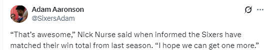 此役取胜后,76人队已经拿到了24胜,与上赛季胜场数持平,纳斯谈到此事时表示:“希望我们还能再多赢一些比赛。”
