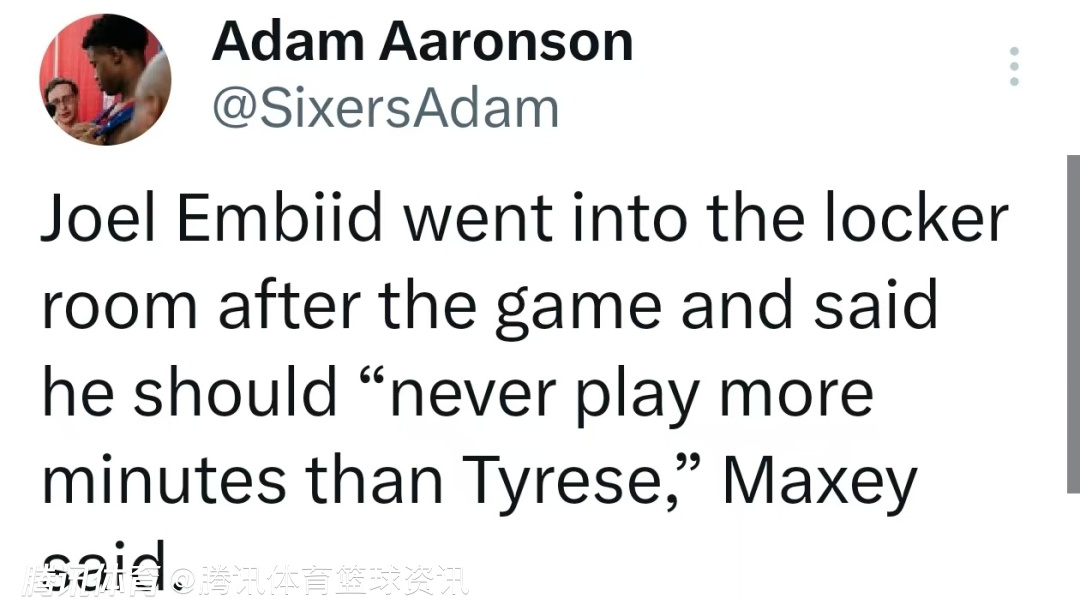 马克西说道:“我们全员健康的感觉简直太棒了。”马克西还透露,恩比德赛后走进更衣室时表示,自己“出场时间绝对不该比马克西多”。本场比赛,恩比德出战45分钟,19投10中,其中三分球3投1中,罚球12投11中,得到32分15篮板10助攻1抢断2封盖。恩比德上一次在常规赛中出战如此长时间,还要追溯到2022年12月对阵湖人时。