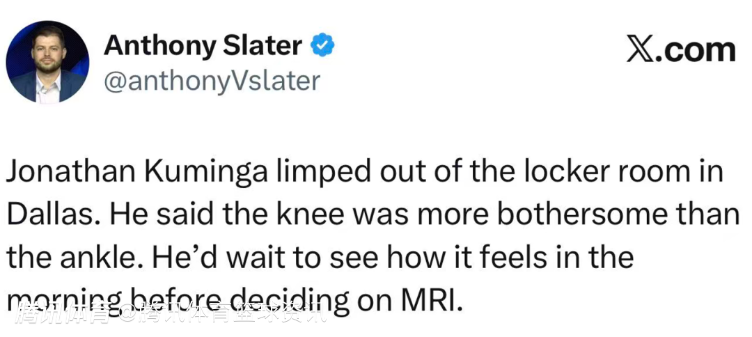据勇士队记Slater报道,联盟消息人士告诉ESPN,经过对脚踝和膝盖的初步检查,目前认为两处伤势都不严重。赛后一瘸一拐走出更衣室的库明加向ESPN表示,膝盖的不适感更强,他会等到明天早上观察体感后,再决定是否接受核磁共振检查。