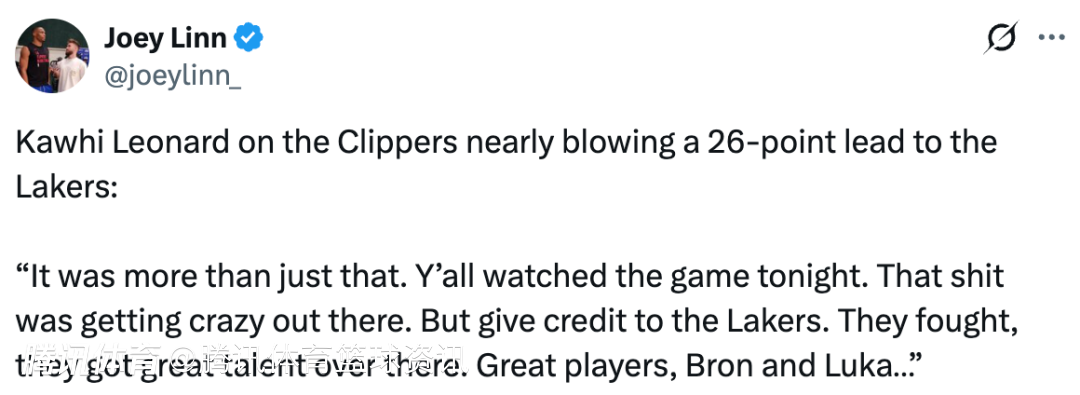 谈到快船队险些被湖人队抹平26分领先优势,小卡表示:“远不止如此,你们今晚都看比赛了,场上局势当时已经失控了。但必须给湖人点赞,他们拼劲十足,阵中也有天赋异禀的球员,詹姆斯和东契奇都是非常出色的球员。”