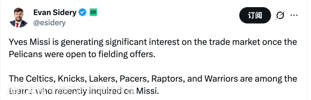 北京时间1月24日,据美记Evan Sidery报道,自从鹈鹕开始愿意听取报价后,米西在交易市场上引发了多支球队的浓厚兴趣,凯尔特人、尼克斯、湖人、步行者、猛龙和勇士等球队,都在近期询问了关于米西的情况。
